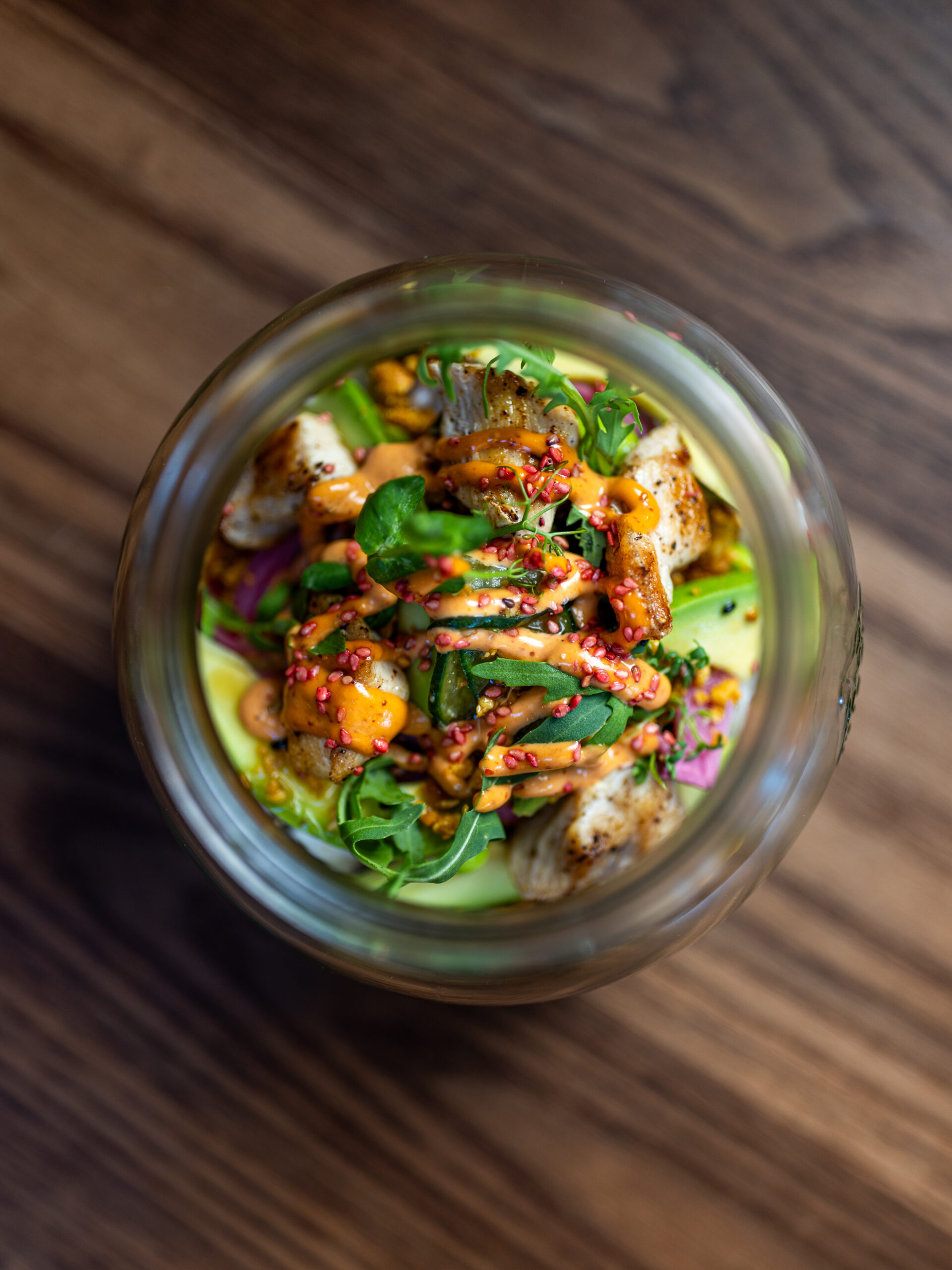 Gebackenes Hühnchen auf Sushi Reis mit eingelegten roten Zwiebeln, Gurke, Edamame, Avocado, Kräutersalat, Cashewkerne, Frühlingslauch Teriyaki Sauce und Chipotle Southwest Sauce (a f g h k)